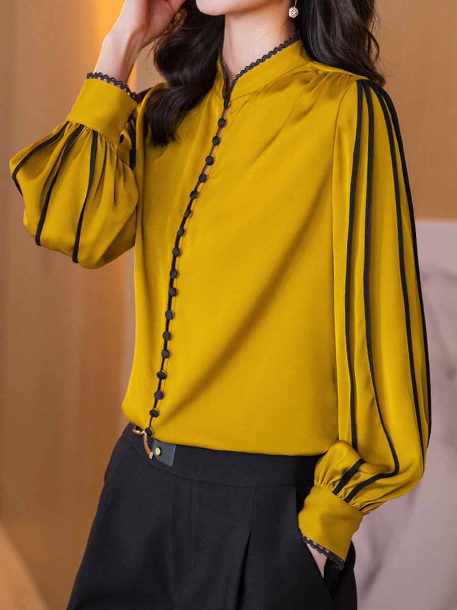 Mooyius presents the Elegant Blouse with Black Trim Accents to elevate your sophisticated look. Elevate your office attire with this elegant mustard blouse. featuring black trim accents and a high neckline for a polished. sophisticated look.Material: Made of durable. premium SatinDesign: Black TrimF..
